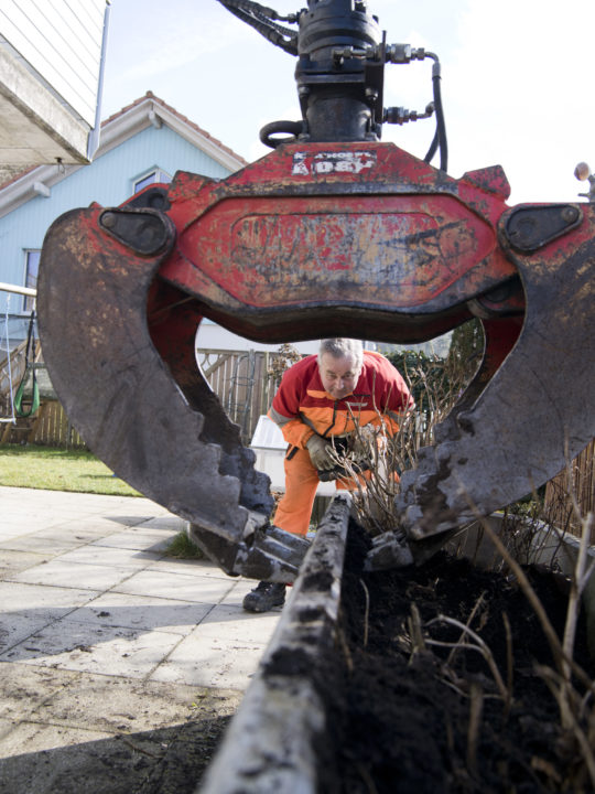 Messerli Transporte ist Barbara Zesigers erster Ansprechpartner. Am Telefon schildert sie dem Service-Center das Problem und vereinbart einen Beratungstermin. Wenig später bespricht Werner Reust, Leiter Transport bei Messerli Transporte, den Fall mit der Kundin vor Ort. Nach kurzem Augenschein kommt er zum Schluss: «Das Problem lösen wir mit unserem Kranwagen – schnell und unkompliziert.» Sowohl das Gewicht als auch die etwas komplizierte Lage der ungeliebten Pflanzkästen sind für das eingespielte Team der Messerli Transporte kein Problem.