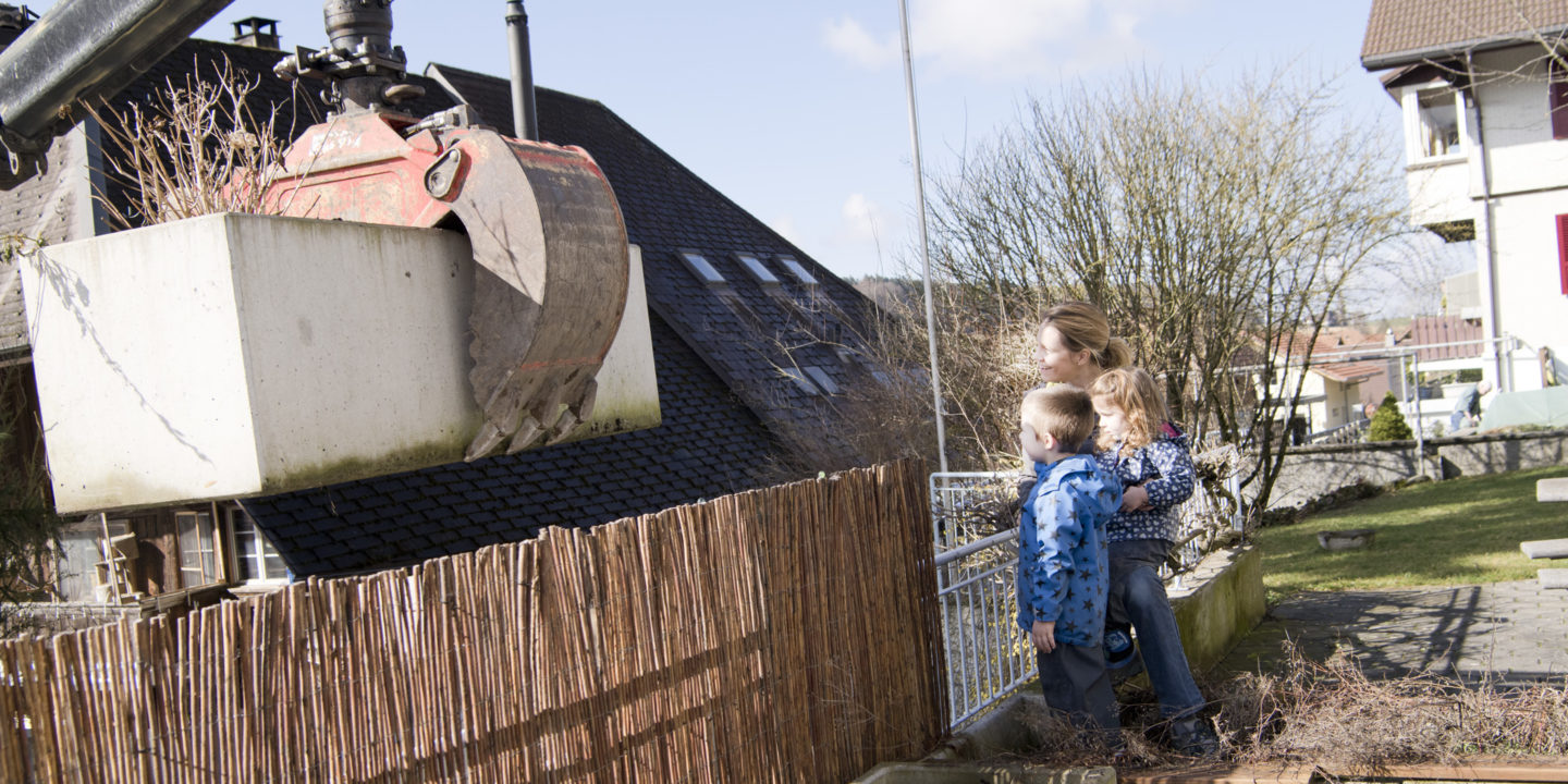Staunend verfolgt Barbara Zesiger mit ihren Kindern wie die tonnenschwere Last von ihrem Grundstück schwebt und sanft im Bauch des Kranwagens landet. Ein Kinderspiel für den Profi!