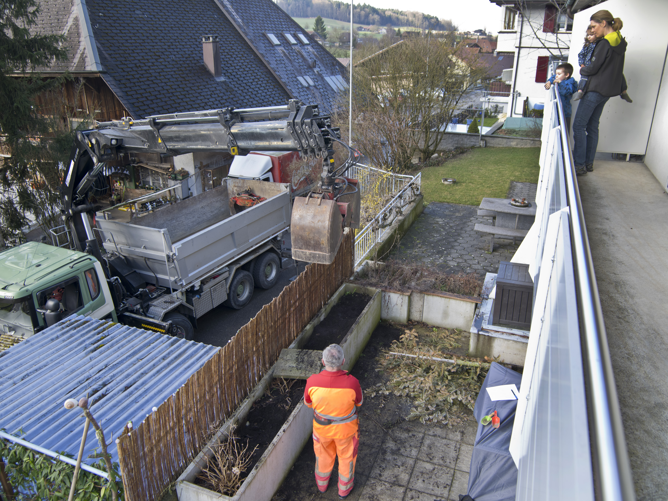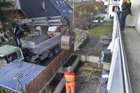 Innerhalb weniger Minuten hievt Kranführer Fritz Glauser die Betonkästen samt Inhalt von Familie Zesigers Terrasse.