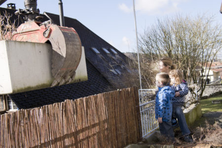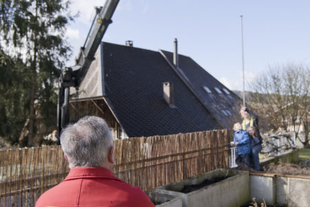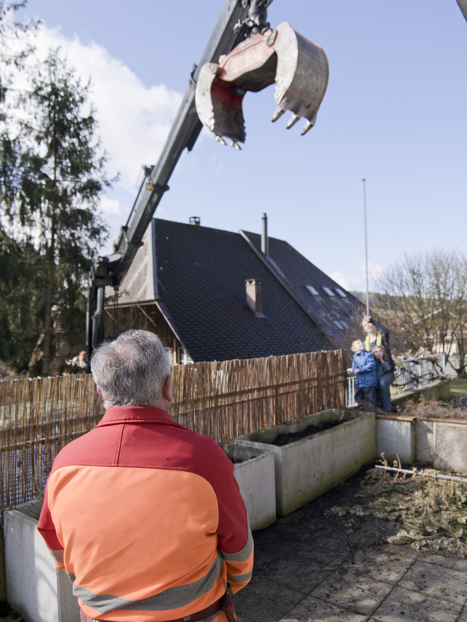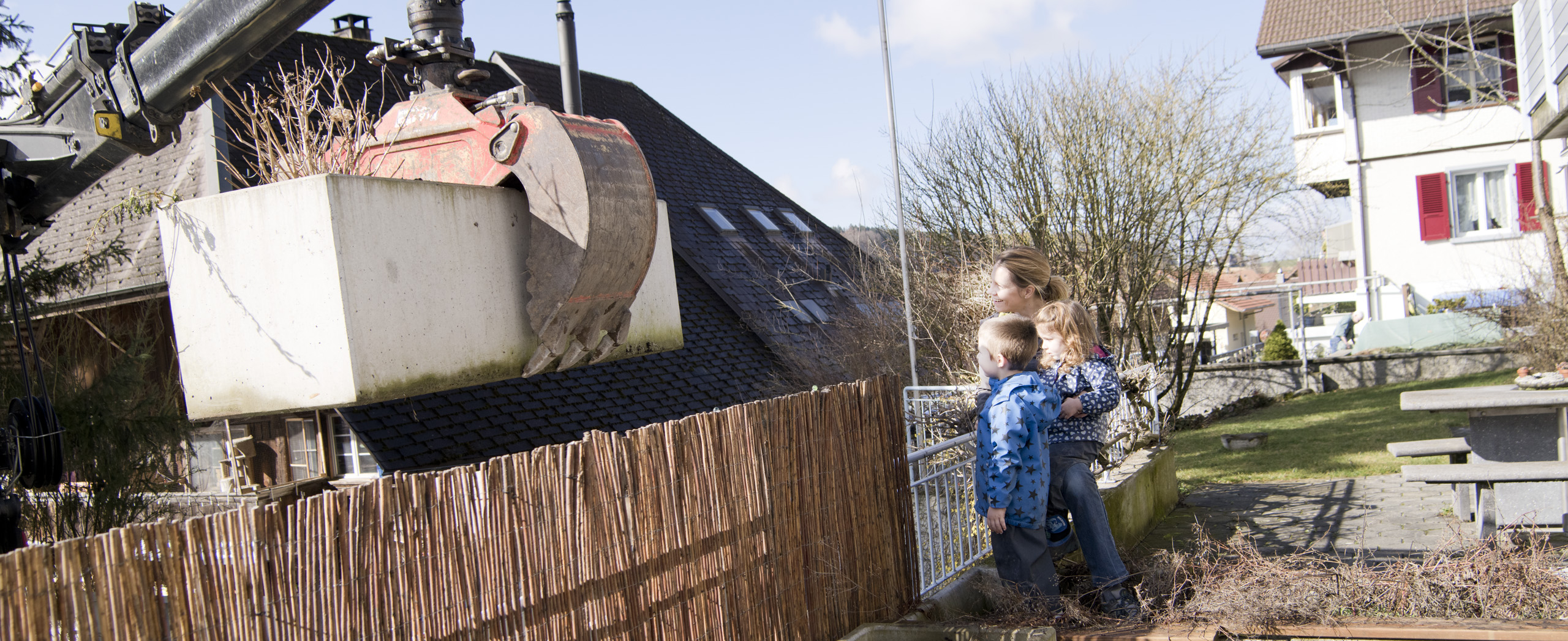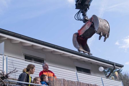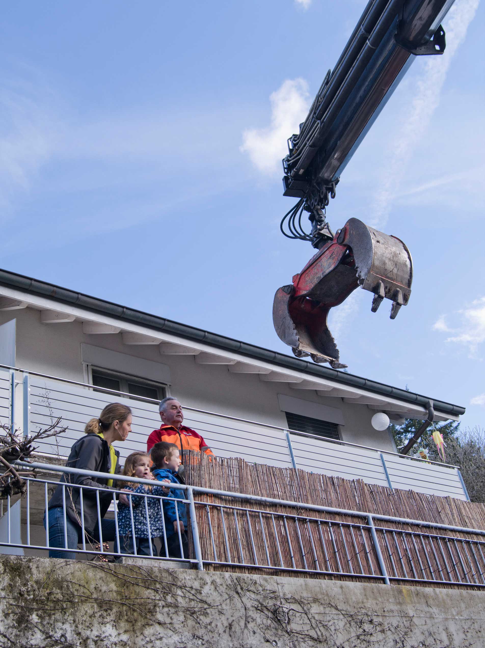 Staunend verfolgt Barbara Zesiger mit ihren Kindern wie die tonnenschwere Last von ihrem Grundstück schwebt und sanft im Bauch des Kranwagens landet. Ein Kinderspiel für den Profi!
